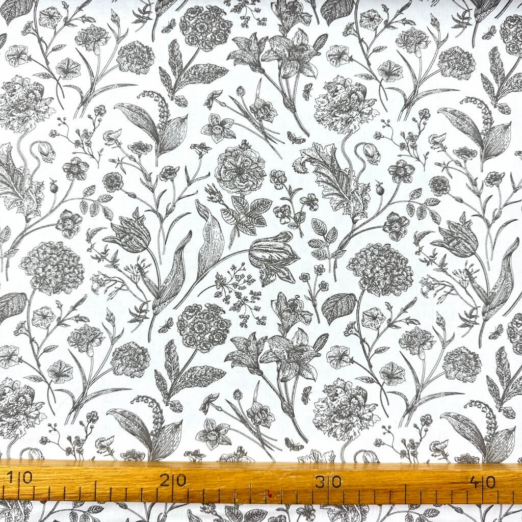 Bavlna vzorovaná - Šedé luční květiny na bílém