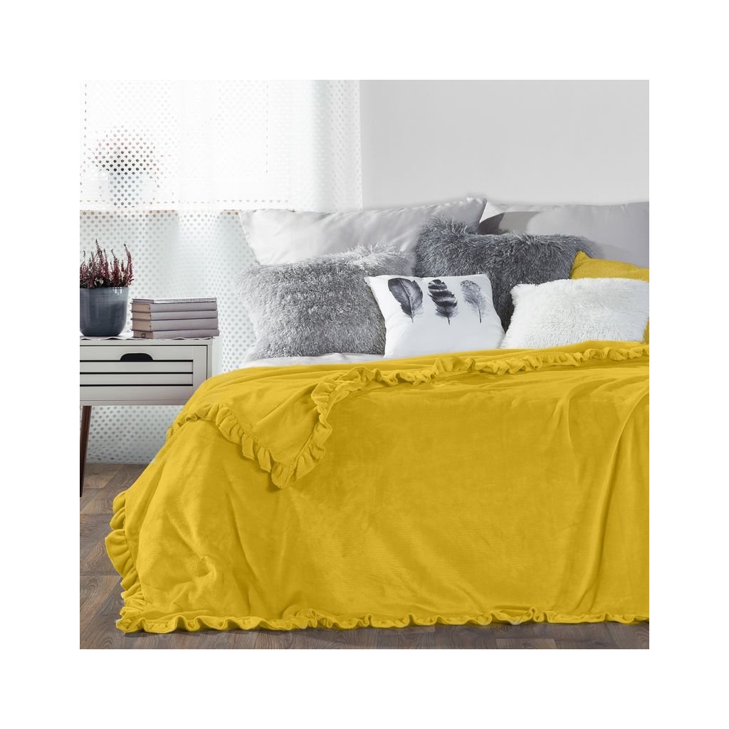 Hladký jednobarevný povlak na přikrývku s širokým ozdobným volánem. Deka z mikroflanelu je měkká a příjemná na dotek, snadno se pere. Ideální pro idylické styly. šířka: 150 cm, délka: 200 cm, barva: hořčicová, hmotnost: 250 GSM, složení: 100 % polyesterDoplňkové parametry