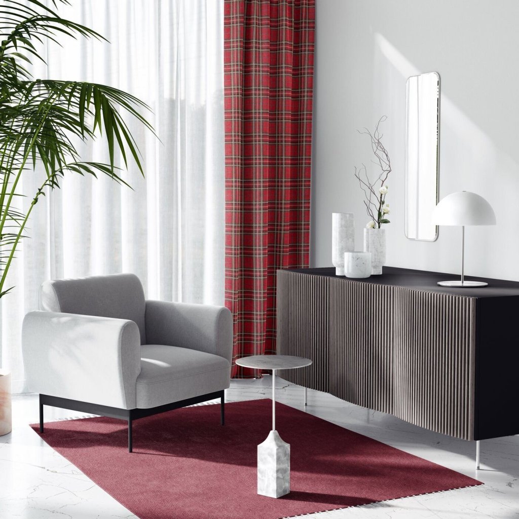 Elegantní žakárová látka zdobená tartanovým vzorem uspokojí vkus milovníků tradičních vzorů i těch, kteří hledají moderní doplňky do interiéru. Nadčasový károvaný vzor se hodí do klasického i moderního interiéru. Žakárový, hrubší a hustě tkaný materiál chrání interiér přes den před sluncem a večer před vnějšími pohledy a vytváří uvnitř příjemnou atmosféru. Díky vysoké kvalitě tkanin a vynikajícím funkčním hodnotám uspokojí závěsy vkus i náročné zákazníky. K závěsům z této látky se budou skvěle hodit jednoduché jemné záclony, ale skvěle vypadají i jako jediná okenní dekorace. Dokonale doplňují podzimně-zimní interiérový design.