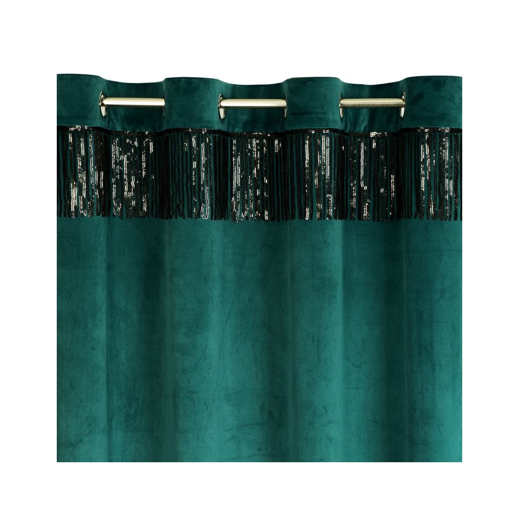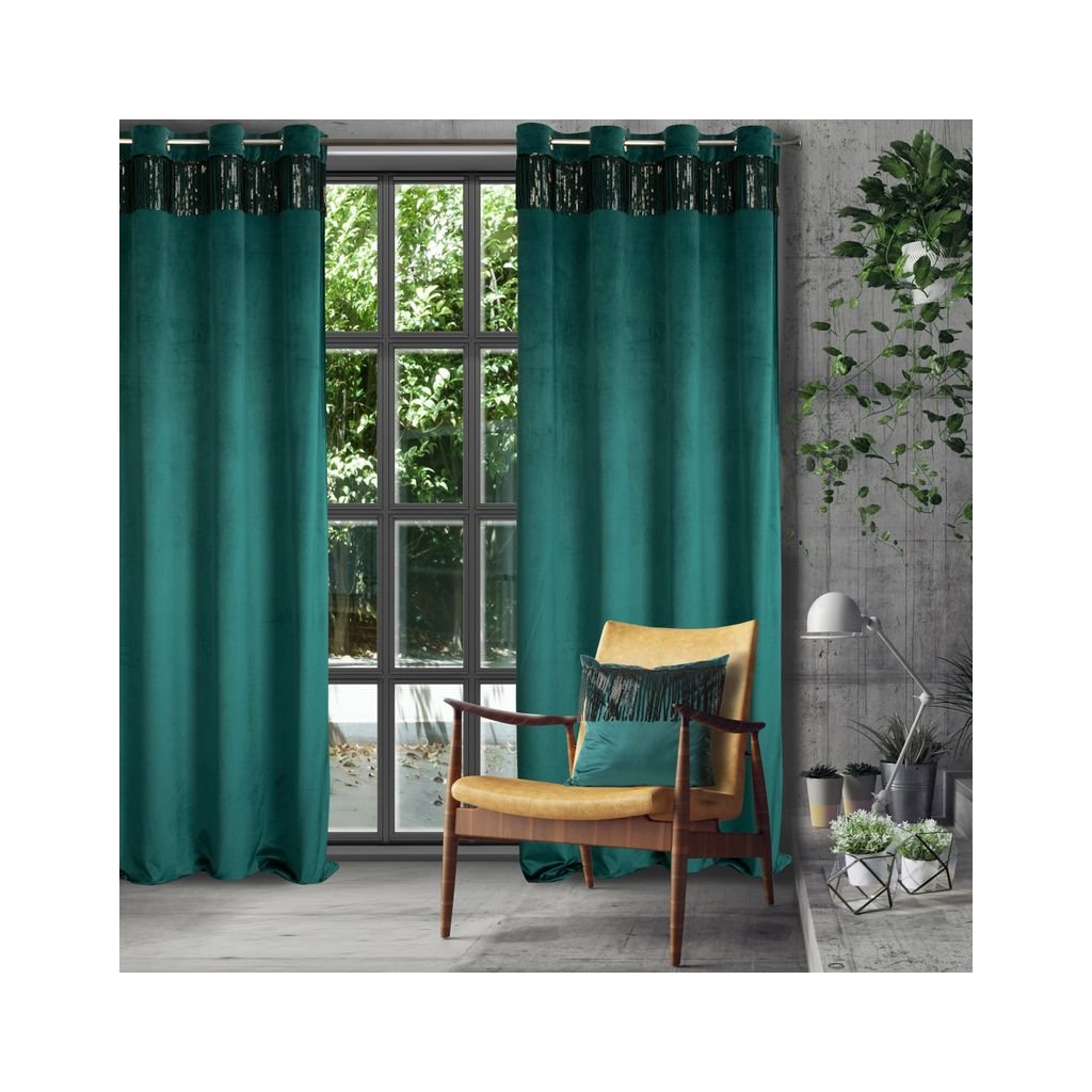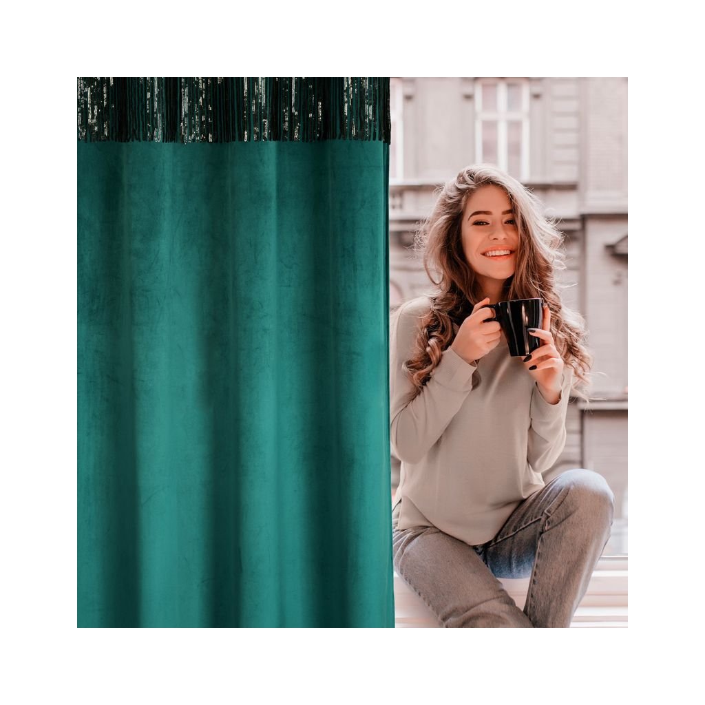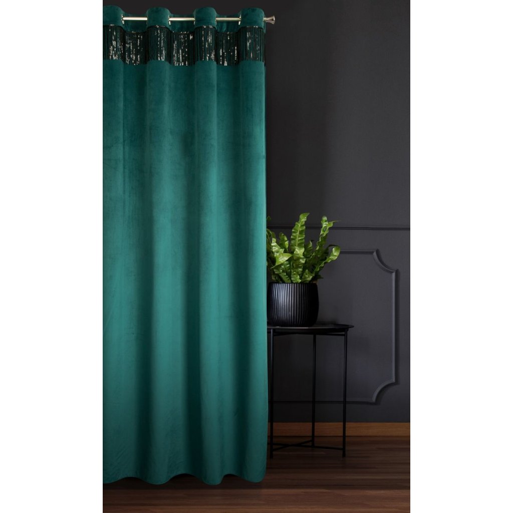 Jemná a ušlechtilá sametová tkanina zdobená v horní části páskem z lesklých flitrů je ozdobou v moderním stylu. Měkké a na dotek příjemné sametové závěsy se sametovou hebkostí a jemným leskem jsou spojením elegance a funkčnosti. Díky silnější a na dotek jemné tkanině s kompaktní strukturou vypadají sametové závěsy nejen elegantně, ale působí také útulně, protože dokonale izolují interiér od slunečního záření a zároveň chrání soukromí. Záclona má 8 oček, díky kterým krásně padne a změna okenní dekorace zabere jen chvilku. Elegantní sametový látkový závěs je design, který se bude líbit zejména milovníkům módního glamour stylu.
