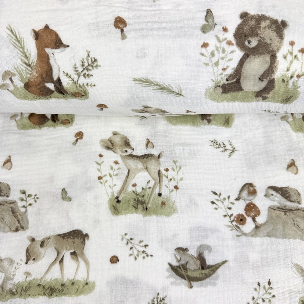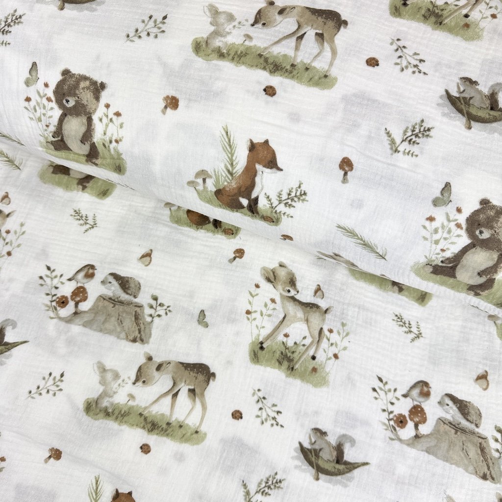 Vzorovaný mušelín / gázovina neboli také fáčovina je jemná, vzdušná a mimořádně příjemná látka vyrobená ze 100 % bavlny. Díky své typické krepové (zvrásněné) struktuře je přirozeně elastický, měkký na dotek a nevyžaduje žehlení. Dvojitá gázovina zajišťuje pevnost materiálu při zachování jeho lehkosti a prodyšnosti. Elegantní vzory dodávají látce originální vzhled, který vynikne při šití dětského i dámského oblečení či bytových doplňků. Mušelín je oblíbený zejména na letní šaty, halenky, sukně, košile, dětská body, zavinovačky, přikrývky nebo šátky.