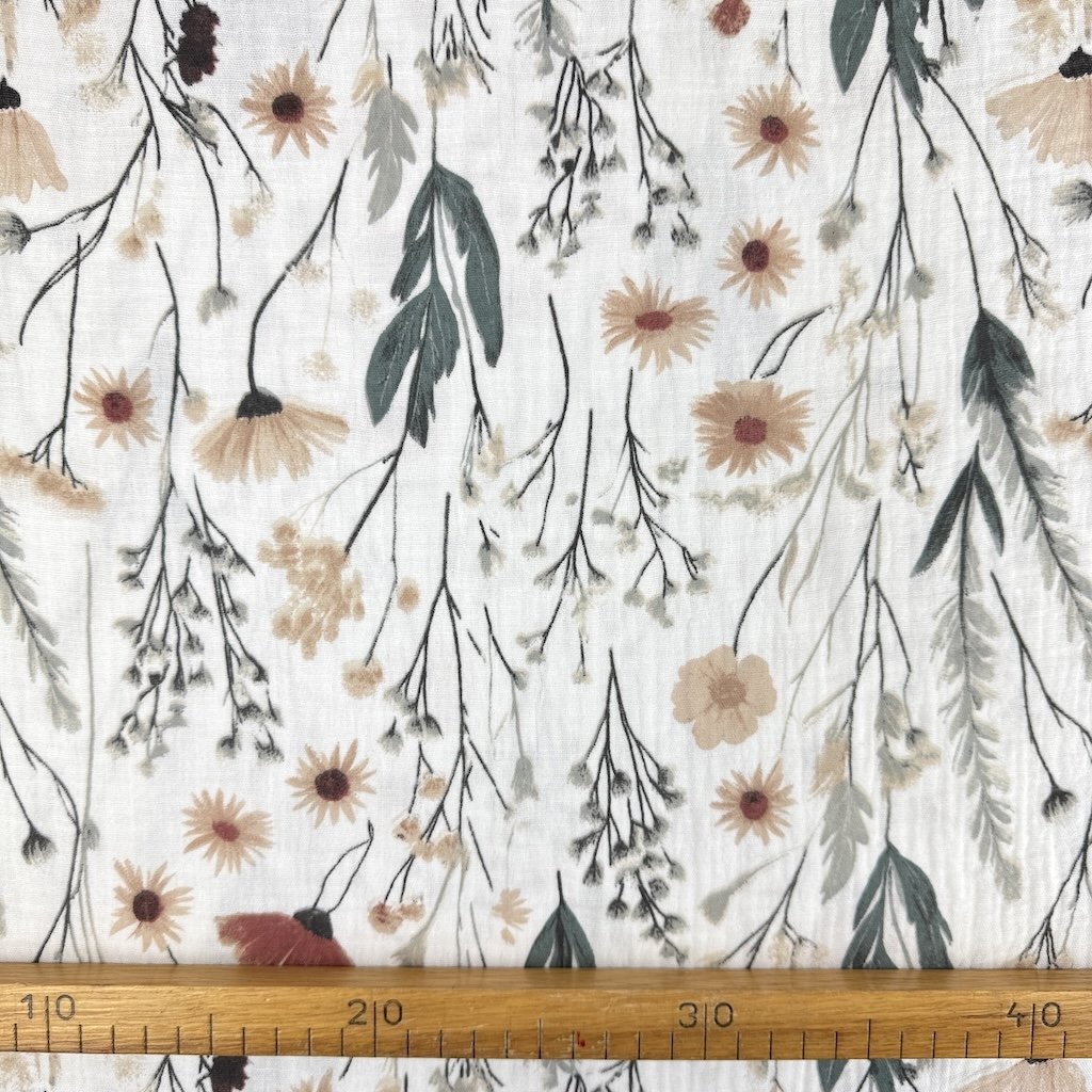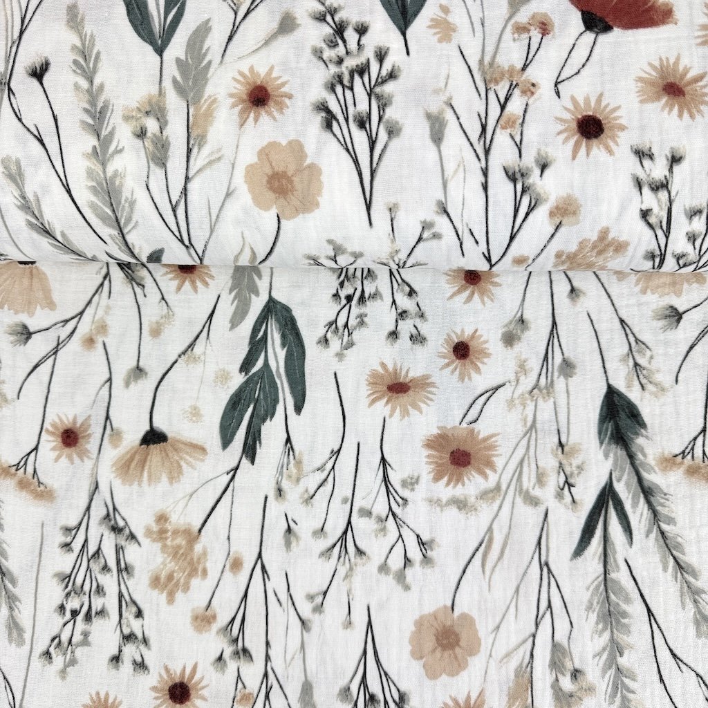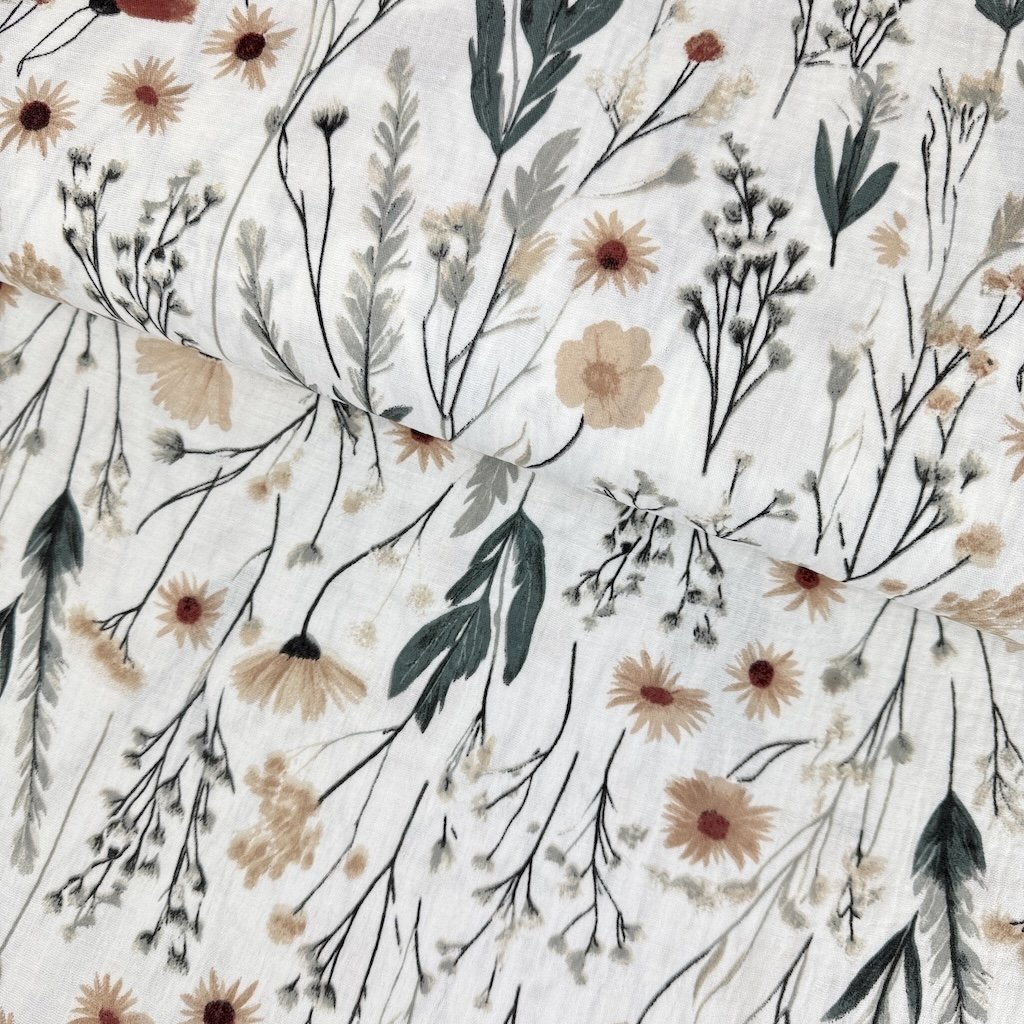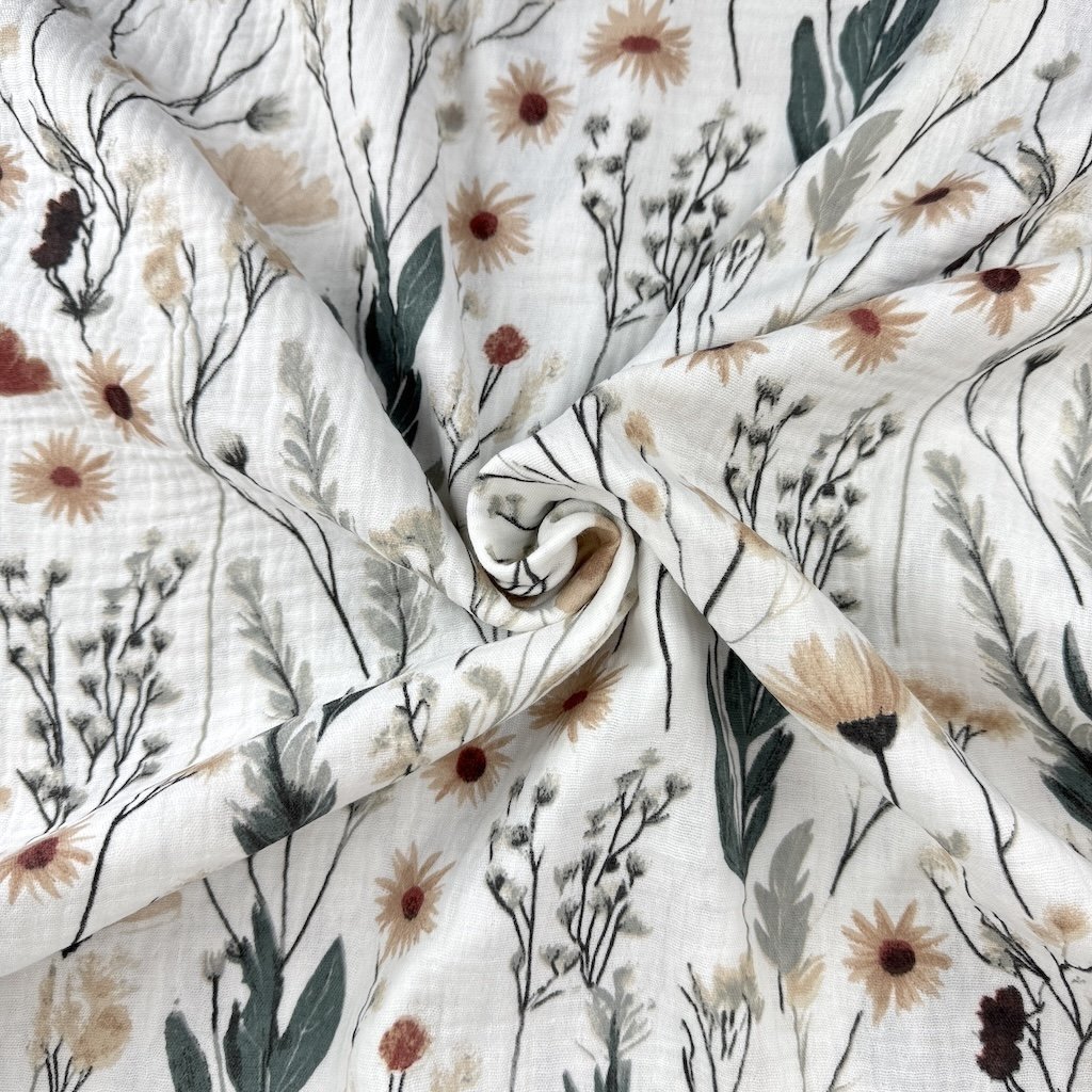 Vzorovaný mušelín / gázovina neboli také fáčovina je jemná, vzdušná a mimořádně příjemná látka vyrobená ze 100 % bavlny. Díky své typické krepové (zvrásněné) struktuře je přirozeně elastický, měkký na dotek a nevyžaduje žehlení. Dvojitá gázovina zajišťuje pevnost materiálu při zachování jeho lehkosti a prodyšnosti. Elegantní vzory dodávají látce originální vzhled, který vynikne při šití dětského i dámského oblečení či bytových doplňků. Mušelín je oblíbený zejména na letní šaty, halenky, sukně, košile, dětská body, zavinovačky, přikrývky nebo šátky.