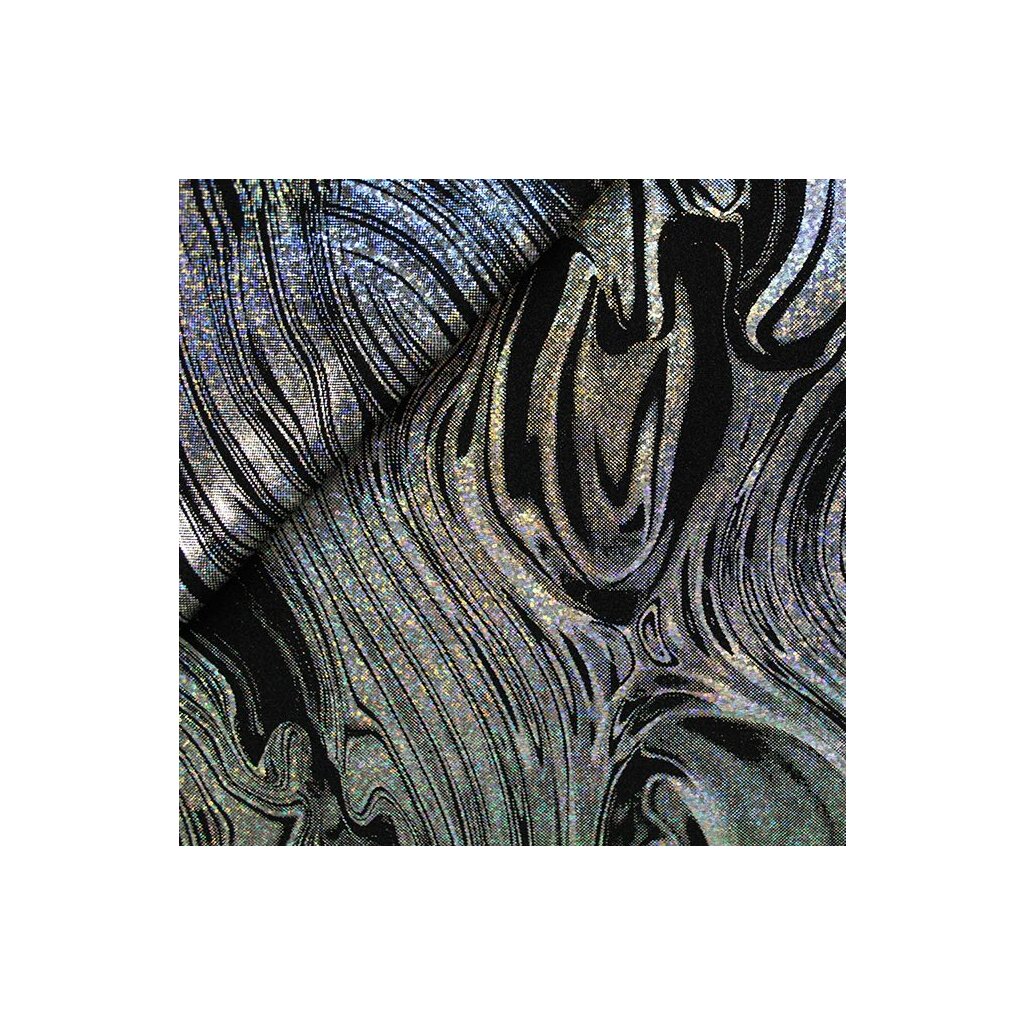 Kvalitní elastický úplet s jednotným základem, na jehož povrchu se střídají efekty stříbrných třpytek, které dodávají výrazný lesk. Látka od evropského výrobce, se složením 80% polyamid a 20% elastan, s gramáží 204 g/m2. Plavkovina je vhodná pro taneční kostýmy, plavky, bikiny, legíny, trikoty, body a šaty.