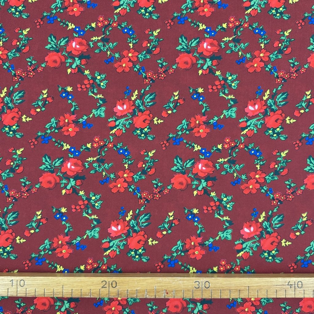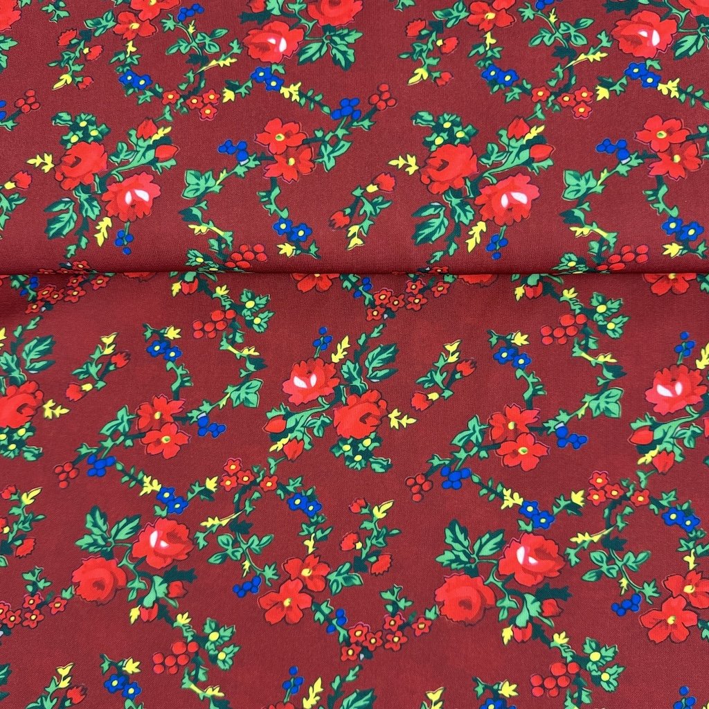 Folklorní tkanina TIBET lidový vzor je splývavá, spadlá tkanina příjemná na dotek, v různých barevných provedeních. Látka s potiskem pestrobarevných drobných květů, gramáží 250 g/m2 a složením ze 100% polyesteru je ideální pro šití folklorních oděvů a doplňků.