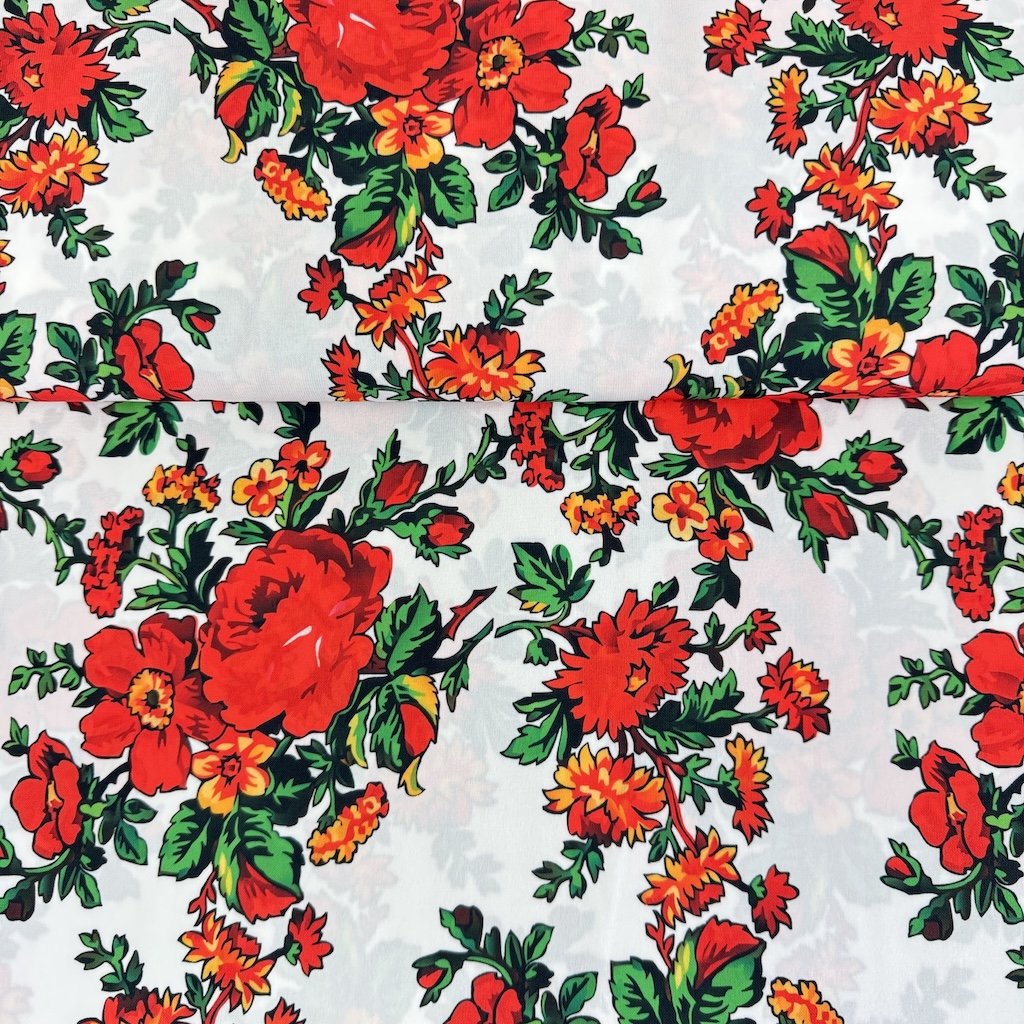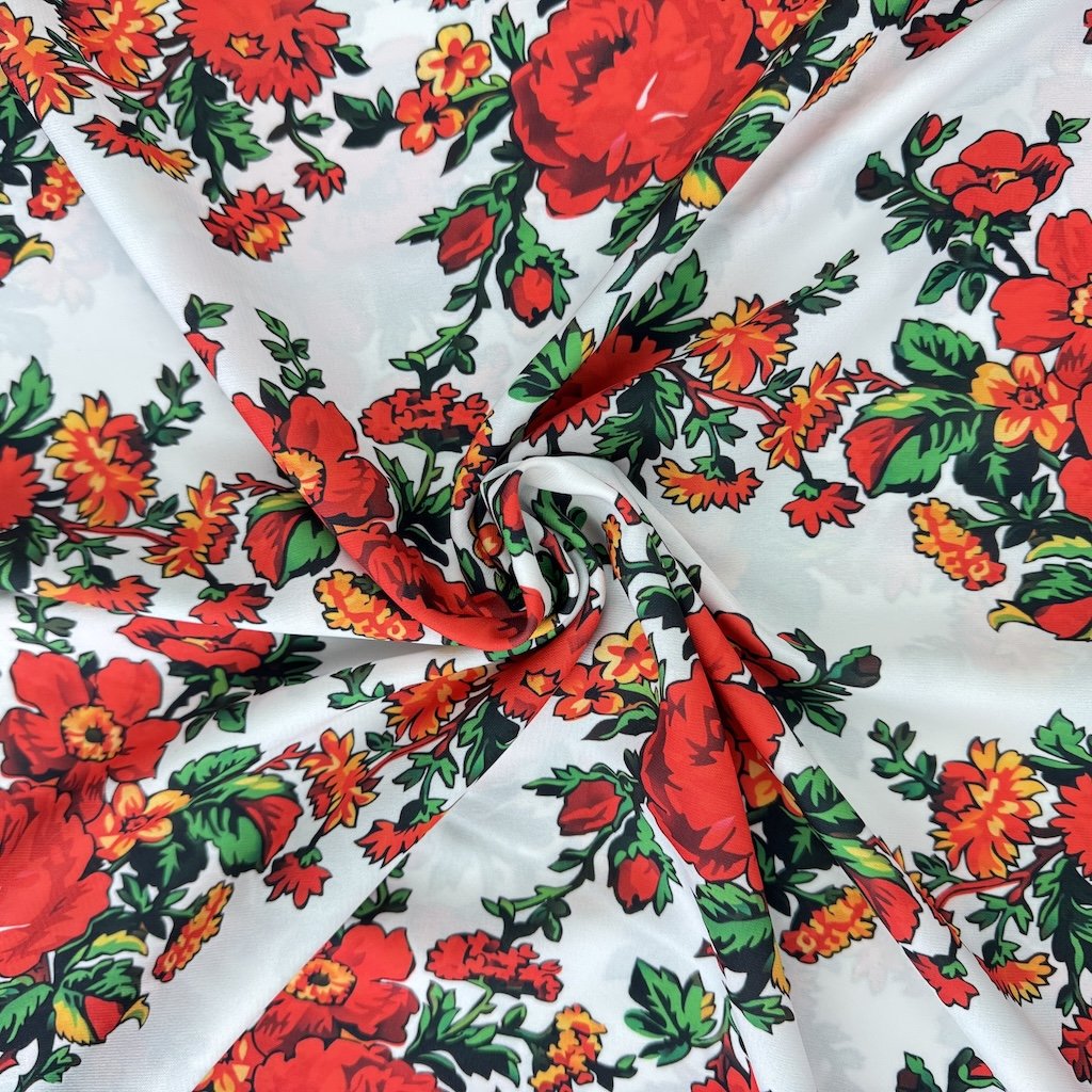 Folklorní tkanina TIBET lidový vzor je splývavá, spadlá tkanina příjemná na dotek, v různých barevných provedeních. Látka s potiskem pestrobarevných drobných květů, gramáží 250 g/m2 a složením ze 100% polyesteru je ideální pro šití folklorních oděvů a doplňků.
