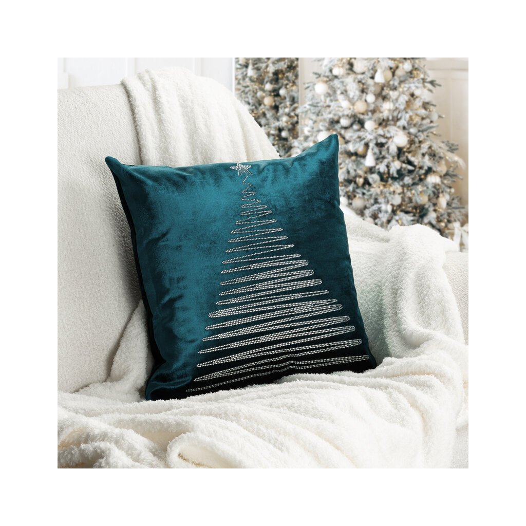 Vánoční dekorační povlak na polštář s lesklým vzorem a ozdobným lemem.
