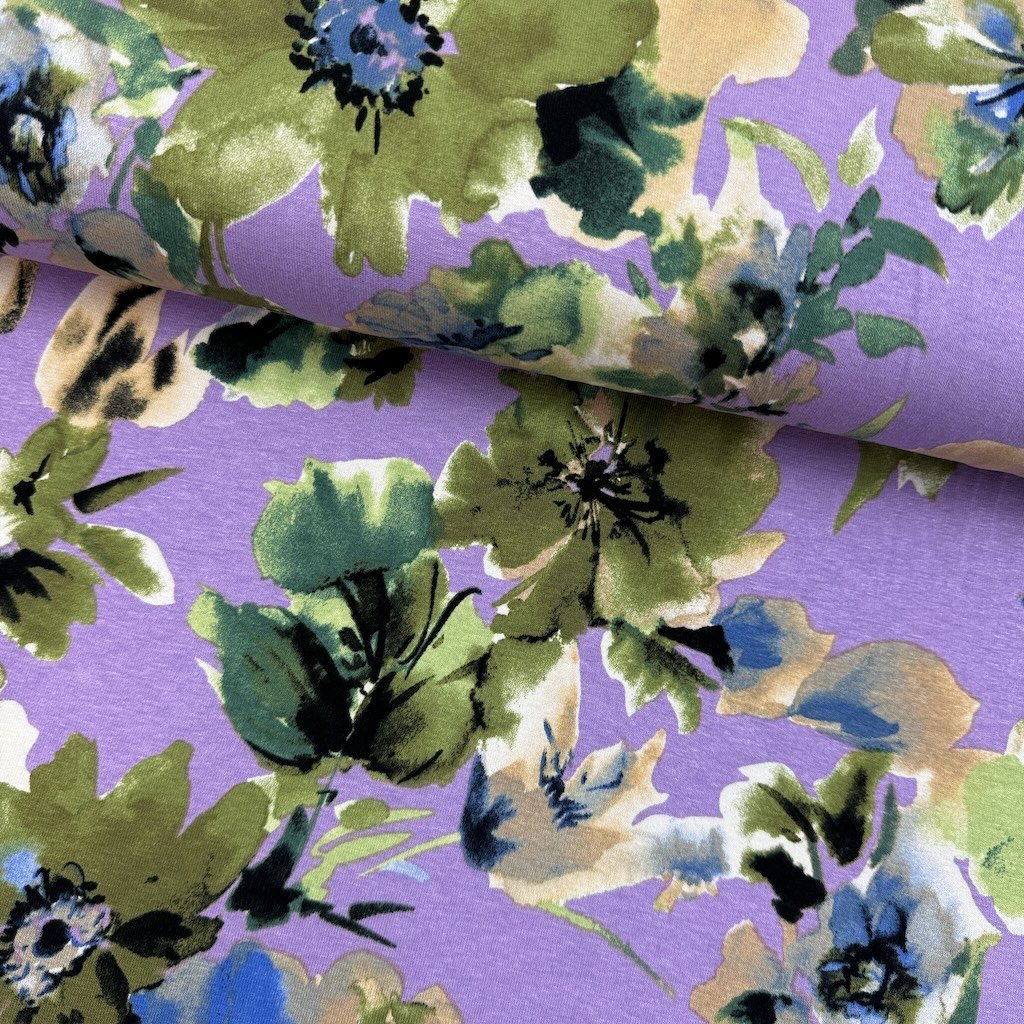 Viskóza s lycrou - Květy na fialovém