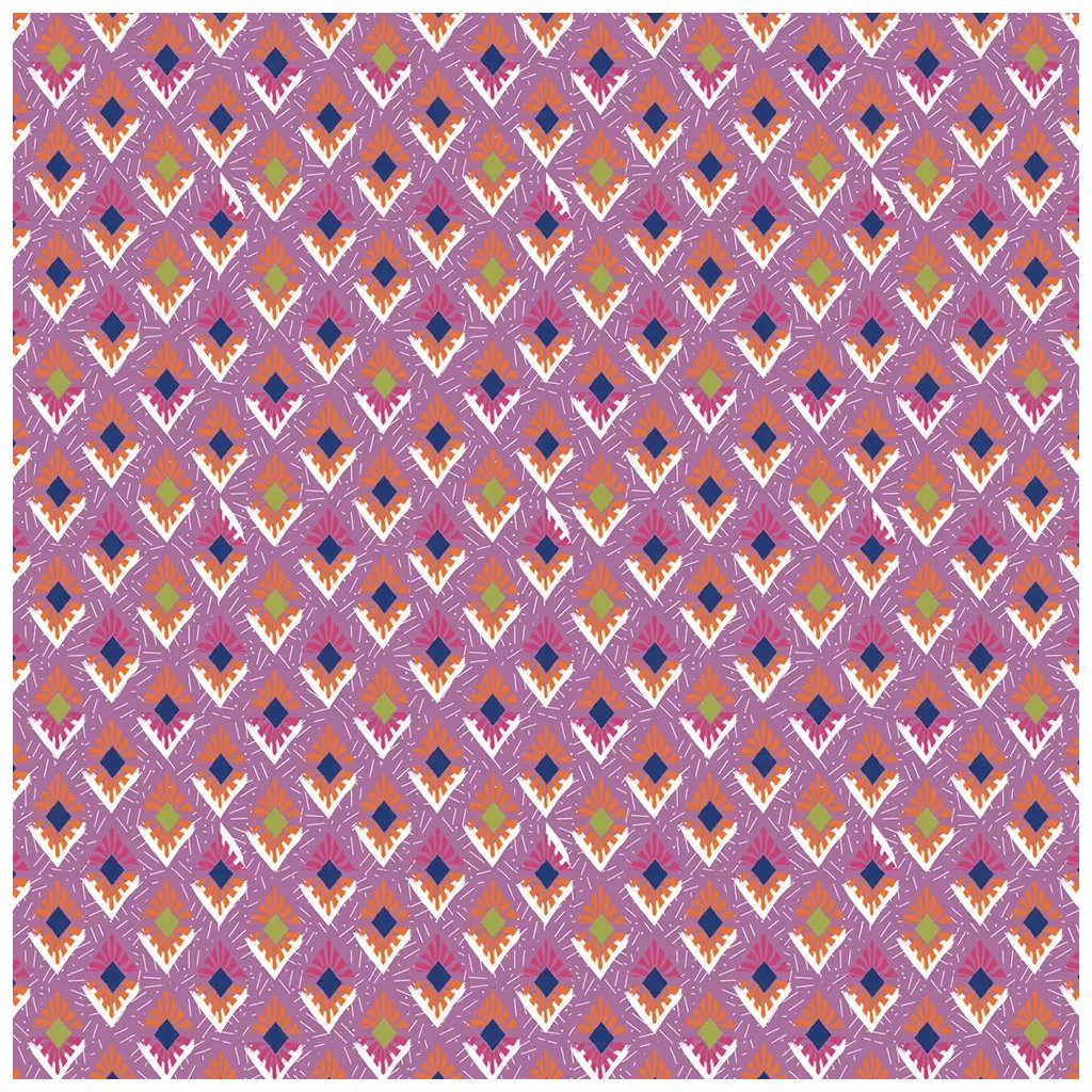 Jemná a zářivá látka ze 100 % viskózy má tkaný kosočtvercový vzor s výraznými odstíny oranžové, růžové a zelené na světle fialovém podkladu.