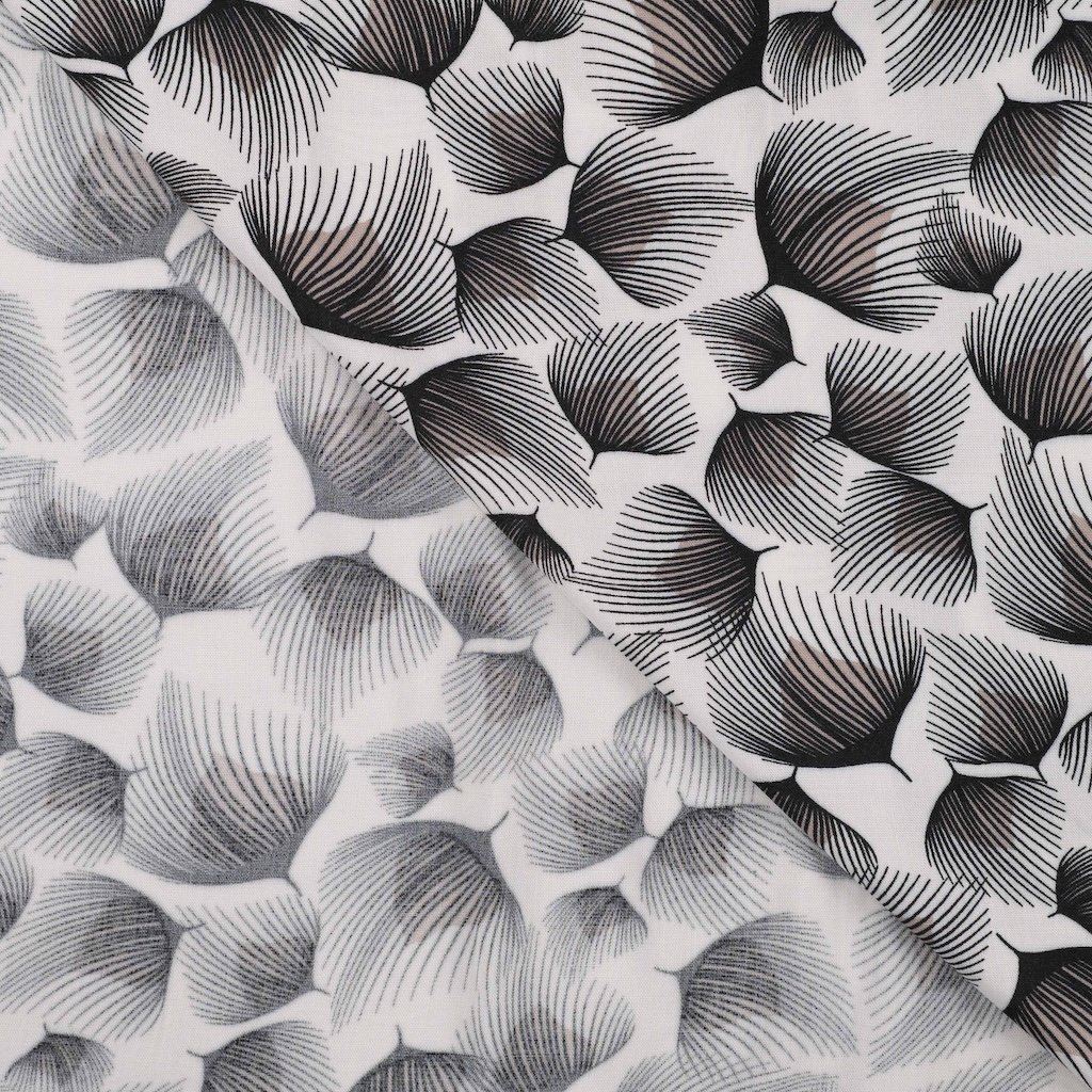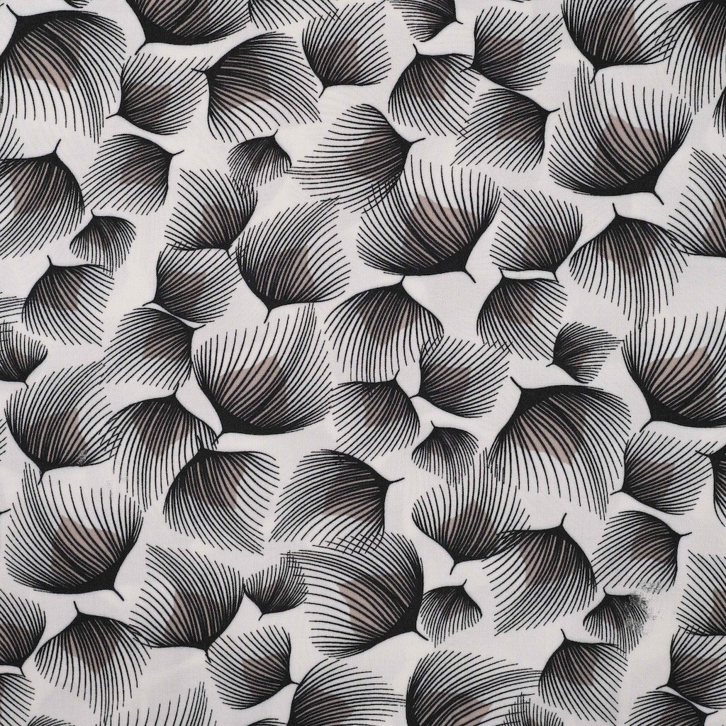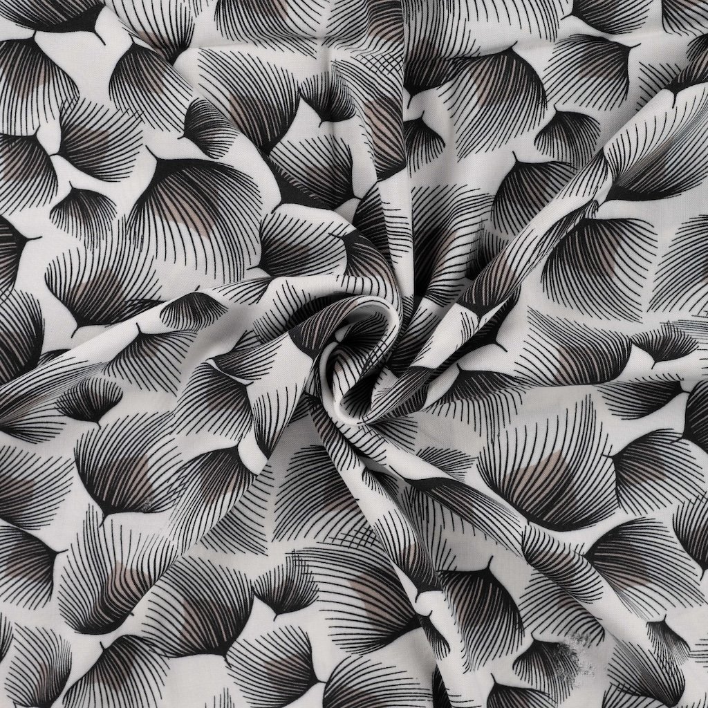 Tento bílý materiál má stylizovanou černo-šedou potisk listů v náhodném uspořádání, která vytváří jemnou a hladkou texturu.