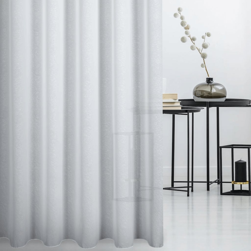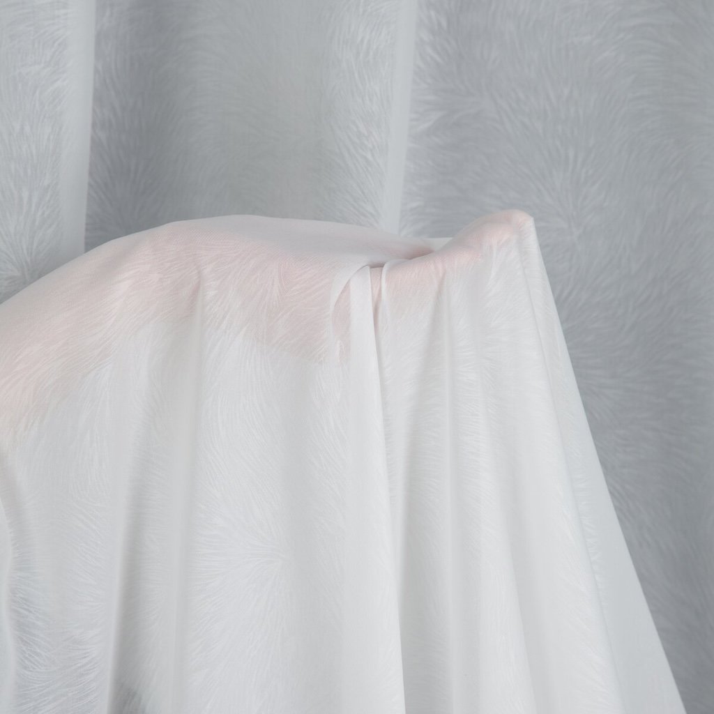 Světlý matný etamin zdobený jemným vzorem na celé ploše je mimořádně efektní a moderní dekorací oken. Jemná tkanina pěkně visí a je univerzálním doplňkem moderních interiérů. Dokonale se hodí také do klasického interiéru. Vypadá skvěle samostatně nebo s hladkými závěsy. Látka dokonale osvěží interiér, zajistí veselou atmosféru a jemný vzor dodává interiéru na originalitě. Látka s poměrně hustou strukturou jemně omezuje sluneční záření, proto ji doporučujeme zejména do interiérů, kde chceme omezit přebytečné sluneční záření. Látka zakončená zavažovacím švem zaručuje zácloně dokonalý vzhled a není třeba ji dodatečně lemovat.